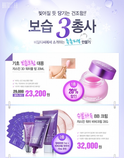 'BRTC 보습 3총사' 이벤트는 건조한 피부를 촉촉하게 관리할 있는 '쟈스민 3D 워터풀 밤'을 20% 할인하며 수분 보호막을 형성하고 촉촉한 피부결 연출을 위한 '쟈스민 워터 비비크림', '바이탈라이저 V10 오일'은 할인과 함께 다양한 사은품이 함께 증정된다.