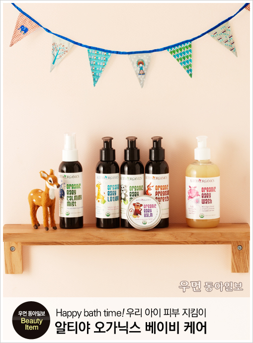 목욕 후, 처음 닿는 제품이라면 성분에 더욱 깐깐해야 한다. 알티야 오가닉스 오가닉 베이비 로션과 베이비 밤은 파라벤, 설페이트 등 화학 성분을 일체 함유하지 않아 피부를 자극 없이 촉촉하게 지켜준다. 베이비 로션을 두드리듯 발라 흡수시킨 후, 건조한 부위에 베이비 밤을 덧발라 보호막을 만들어준다.