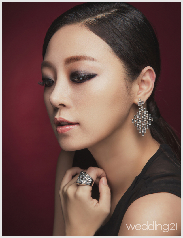이브닝 파티의 시그너처인 블랙 스모키 아이 메이크업. 아이홀까지 은은하게 골드 베이스를 발라준 후 그레이 컬러로 쌍꺼풀 라인부터 언더까지 음영을 넣었다. 더욱 강렬한 눈매를 위해 자연스러운 블랙 그러데이션을 언더까지 연결해 에지 있는 눈매를 완성했다. 링과 이어링은 스와로브스키.
