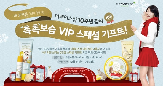 11월26일부터 12월15일까지 20일 동안 전국 매장에서 품목별로 50~20% 할인 행사를 진행 중인 더페이스샵은 창립 10주년을 기념해 오늘 9일부터 12일까지 4일간 VIP 회원고객에게 감사선물 증정 행사를 진행한다.